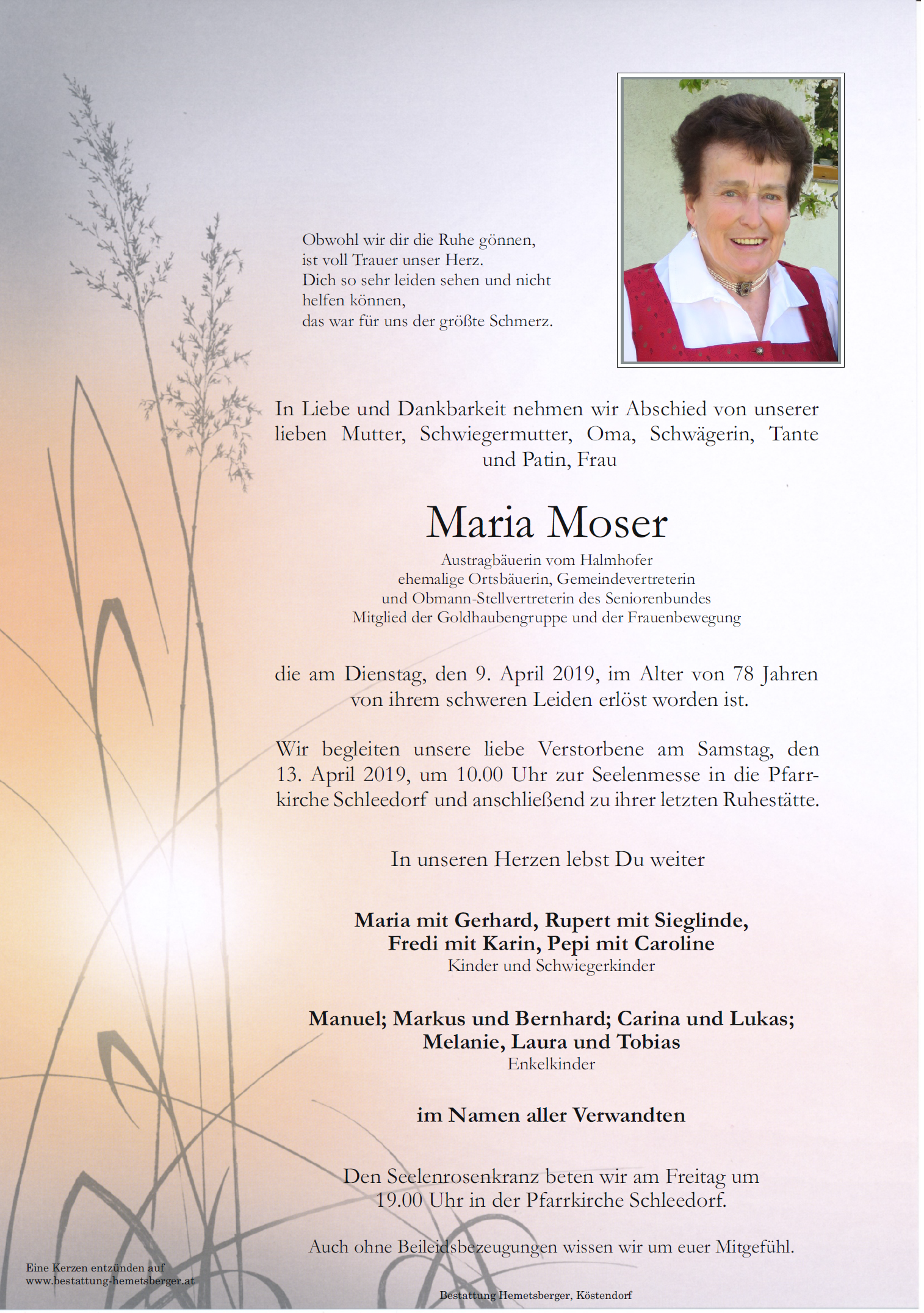 19. Wo einst ein Mensch aus Fleisch und Blut ruht jetzt nur Erde aber das Lachen und .die Erinnerung des geliebten Menschen bleiben und damit können wir auf Erden verweilen Aufrichtige Anteinahme wünscht euch eure frühere Nachbarin Barbara Zimmerbauer Moser