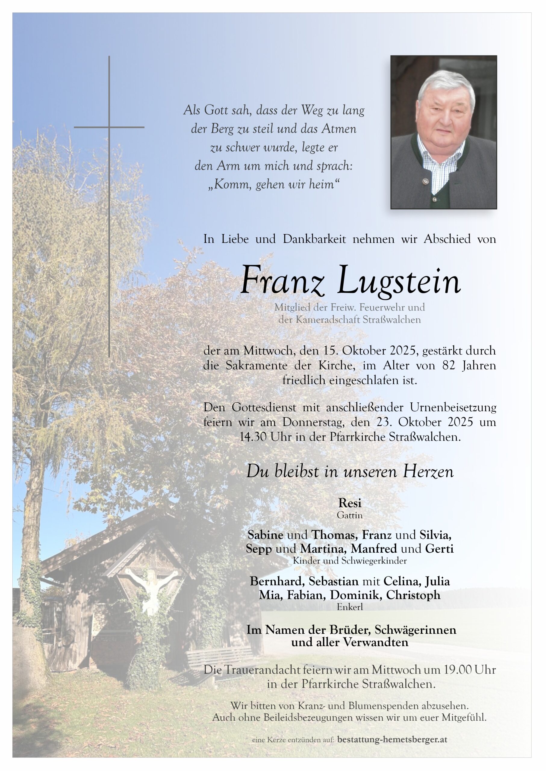 Lieber Franz ! Ein Licht für Deine letzte Reise. Ruhe in Frieden. Der gesamten Trauerfamilie unsere aufrichtige Anteilnahme. Franz u. Anni Herzog