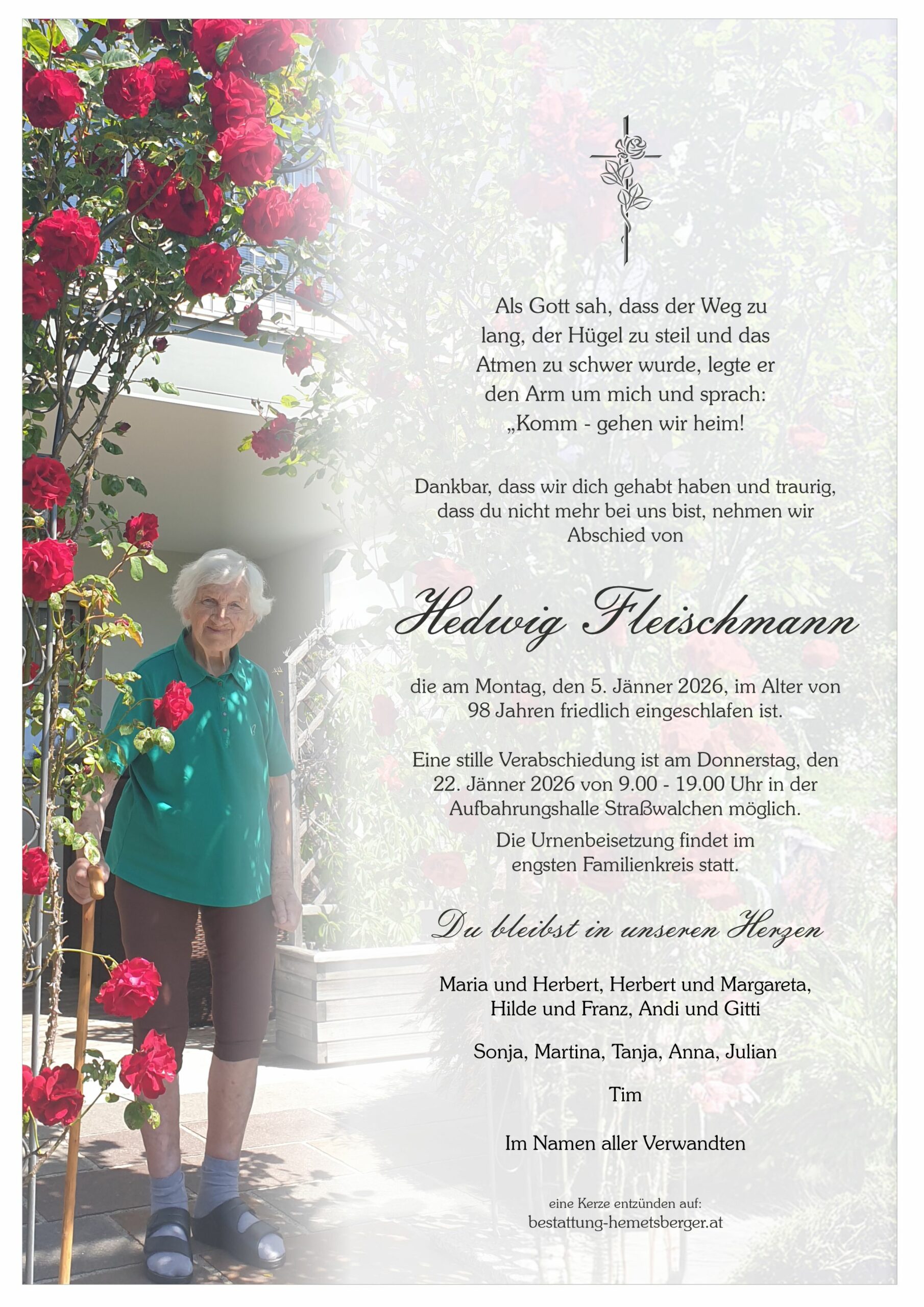 Liebe Godn! Ich möchte dir für all deine Liebe, Fürsorge und Geborgenheit, die ich als Kind bei dir gefunden habe, danken. Immer habe ich mich bei dir und von dir geliebt gefühlt. Dafür kann ich gar nicht genug danken. Mögen viele Engel für dich bereit stehen und viele Kerzen dich auf deinem Weg in die Ewigkeit begleiten. Für immer in meinem Herzen. Dein Patenkind Heidi Breitwimmer